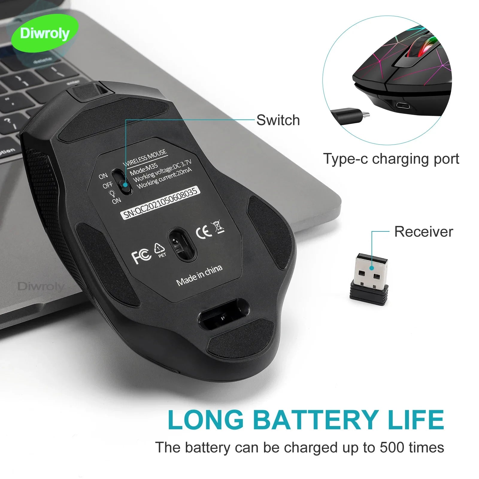 2.4G Wireless Mouse Rechargeable Gamer PC Mice Ergonomic 400mAh with 1600DPI Gaming Mice for Office Laptop with Windows Mac