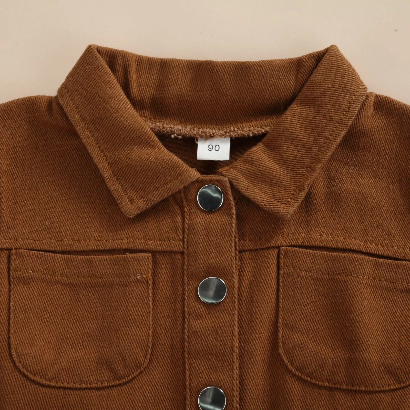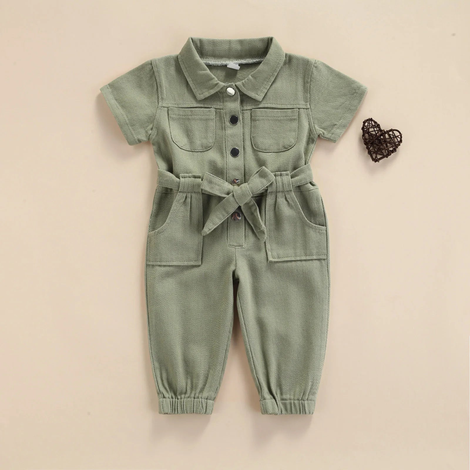 Little girls fashion solid color lapel pocket long sleeve jumpsuit --- The texture is soft and the hand feels delicate like a cloud;