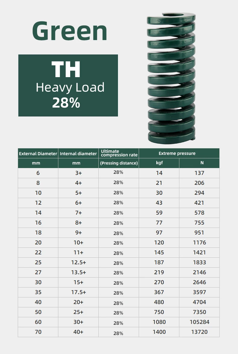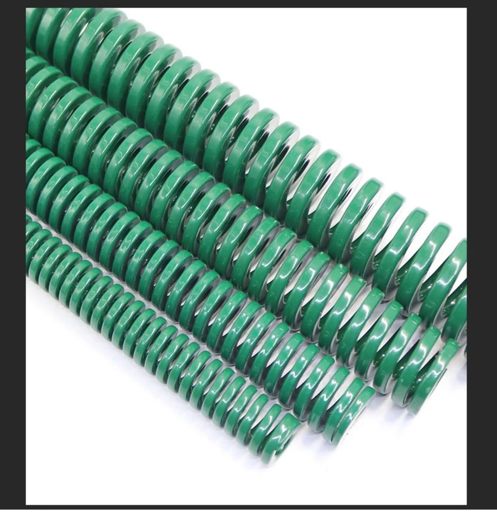 【Applicable fields】: Mold springs are widely used in stamping dies,metal die-casting dies,plastic molds,and other elastic motion precision machinery and equipment. Description: Yellow and blue are mainly used for plastic mold assembly. Red,green and brown are mainly used for hardware assembly.