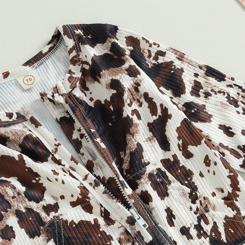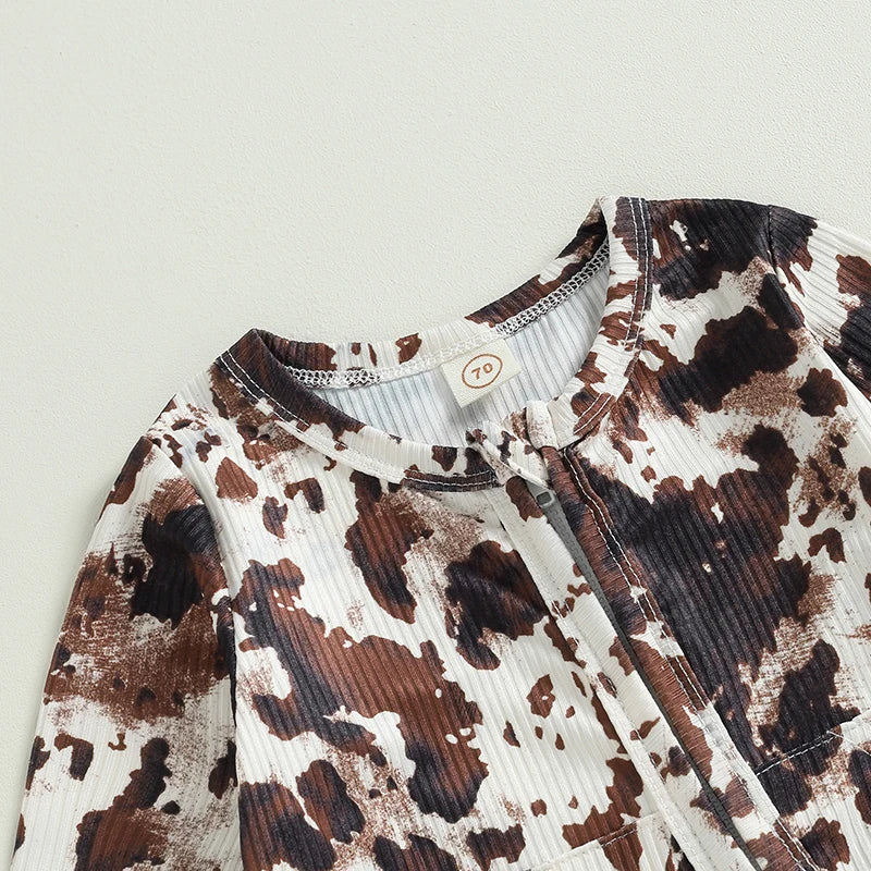 FOCUSNORM 0-18M Autumn Baby Girls Boys Western Jumpsuits Cow Print Long Sleeve Zipper Pocket Romper Pants